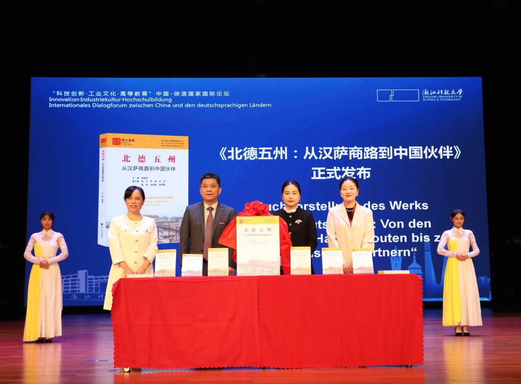 开幕式上还举行了学校德语国家研究最新成果《德国经济发展蓝皮书2024》与《北德五州:从汉萨商路到中国伙伴》的新书发布仪式。浙江大学出版社国际文化出版中心主任包灵灵,《德国经济发展蓝皮书2024》主编、浙江科技大学管理学院院长董颖,《北德五州:从汉萨商路到中国伙伴》主编,加拿大28 、中德工程师学院执行院长韩晓亚分别致辞。徐华军、董颖、韩晓亚、包灵灵以及浙江大学出版社编辑史明露分别为新书发布揭幕。